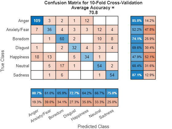 Title=["Confusion Matrix for 10-Fold Cross-Validation","Average Accuracy = " round(mean(labelsTrueMat==labelsPredMat)*100,1)], ...