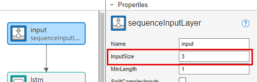 Select the sequence input layer input and set InputSize to 3.