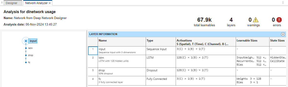 Doing so opens a prebuilt network suitable for sequence classification problems. The network contains these layers: