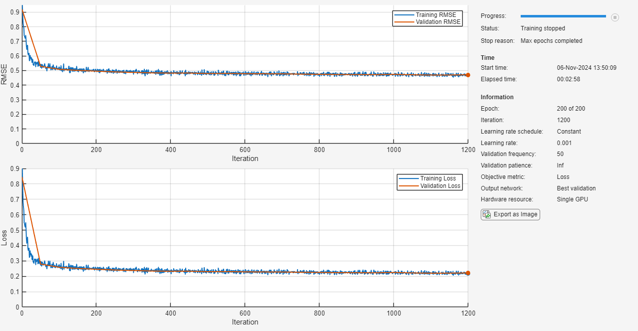 options = trainingOptions("adam", ... MaxEpochs=200, ... SequencePaddingDirection="left", ... Shuffle="every-epoch", ... ValidationData={XValidation,TValidation}, ... Metrics="rmse", ... Plots="training-progress", ... Verbose=false);