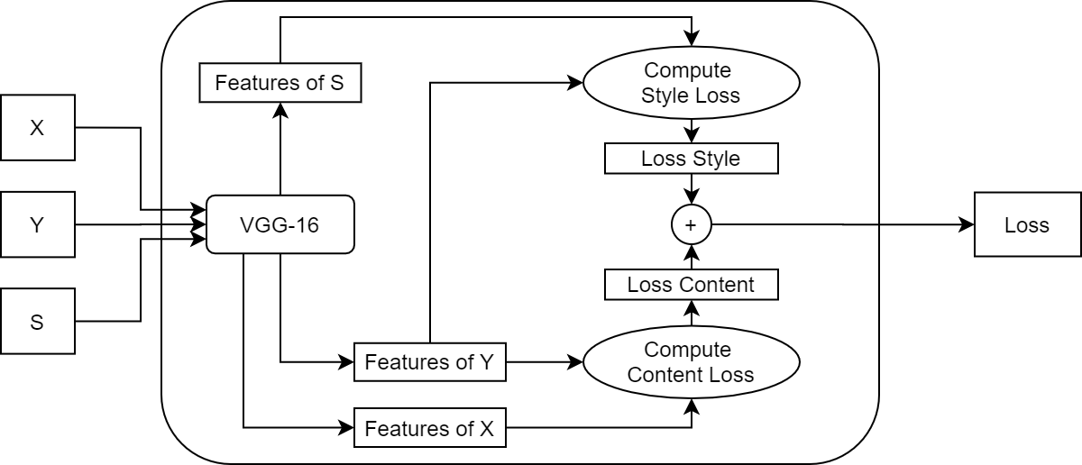 First, the function passes the input images X, the transformed images Y and the style image S to the pretrained network VGG-16. This pretrained network extracts several features from these images. The algorithm then calculates the content loss by using the spatial features of the input image X and of the output image Y. Moreover, it calculates the style loss by using the stylistic features of the output image Y and of the style image S. Finally, it obtains the total loss by adding the content and style losses.