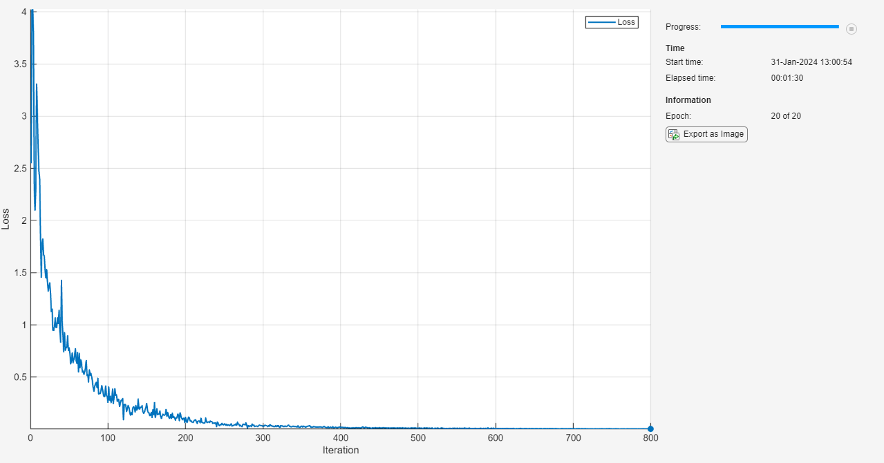 numObservations = size(XTrain,4); numIterationsPerEpoch = ceil(numObservations/miniBatchSize); numIterations = numIterationsPerEpoch * numEpochs; monitor = trainingProgressMonitor( ... Metrics="Loss", ... Info="Epoch", ... XLabel="Iteration");