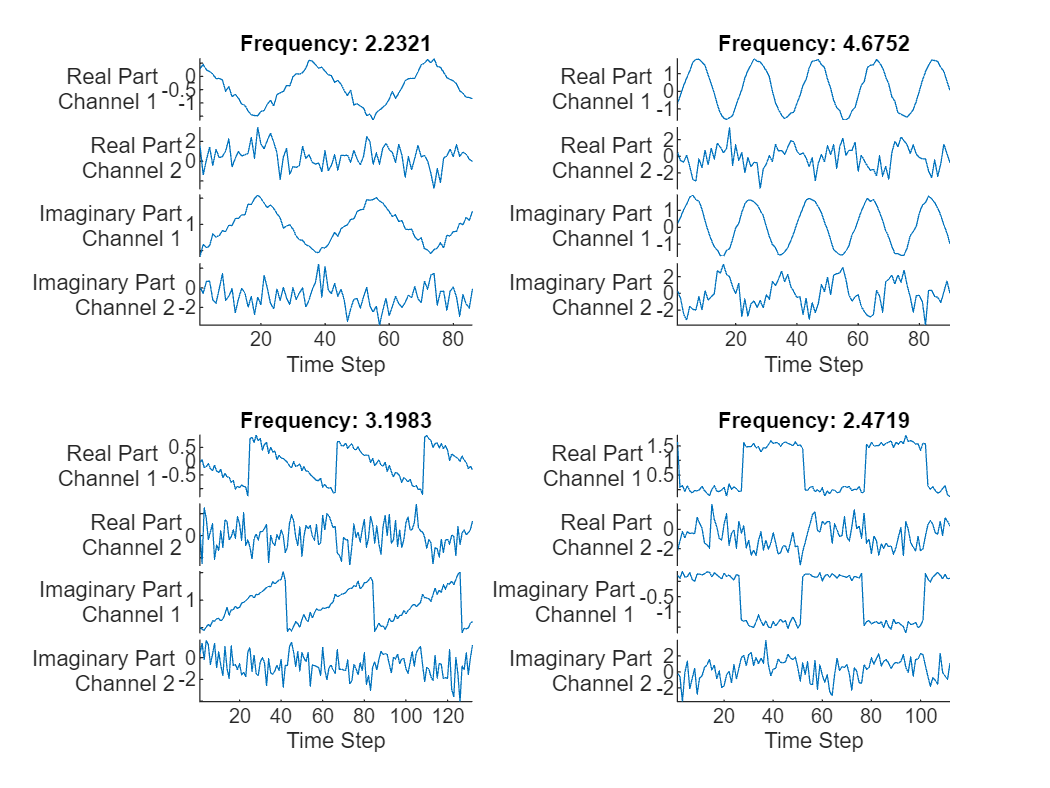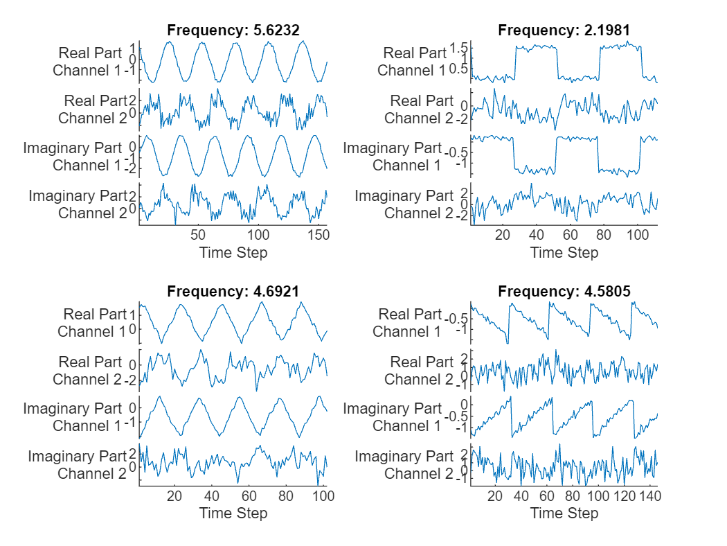 displayLabels = [ ... "Real Part" + newline + "Channel " + string(1:numChannels), ... "Imaginary Part" + newline + "Channel " + string(1:numChannels)]; figure tiledlayout(2,2) for i = 1:4 nexttile stackedplot([real(XTest{i}') imag(XTest{i}')], DisplayLabels=displayLabels); xlabel("Time Step") title("Frequency: " + YTest(i)) end