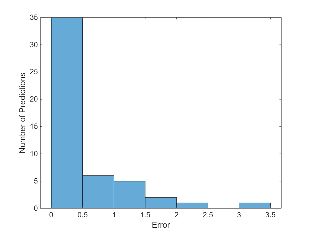 figure histogram(mean((TTest - YTest).^2,2)) xlabel("Error") ylabel("Number of Predictions")