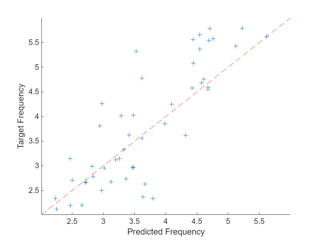 figure scatter(YTest,TTest,"+"); xlabel("Predicted Frequency") ylabel("Target Frequency") hold on m = min(freq); M = max(freq); xlim([m M]) ylim([m M]) plot([m M], [m M], "--")