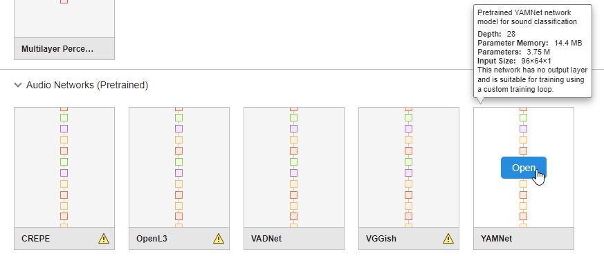 Deep Network Designer provides a selection of pretrained audio classification networks. These models require both Audio Toolbox™ and Deep Learning Toolbox™.
