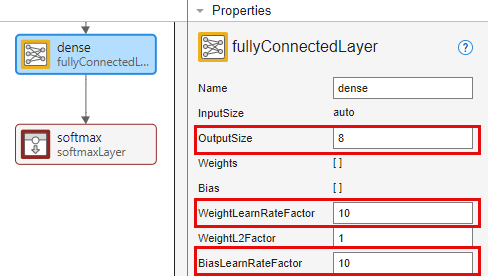 Change the learning rates so that learning is faster in the new layer than in the transferred layers by setting WeightLearnRateFactor and BiasLearnRateFactor to 10.