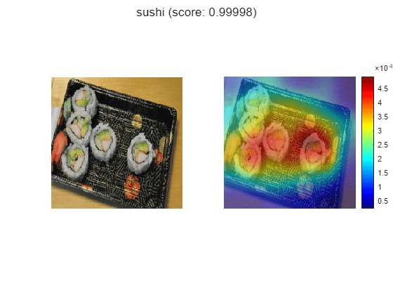 The network is doing well at classifying those kinds of sushi. However, to verify that this is true and to better understand why the network makes its decisions, use a visualization technique like Grad-CAM. For more information on using Grad-CAM, see Grad-CAM Reveals the Why Behind Deep Learning Decisions.