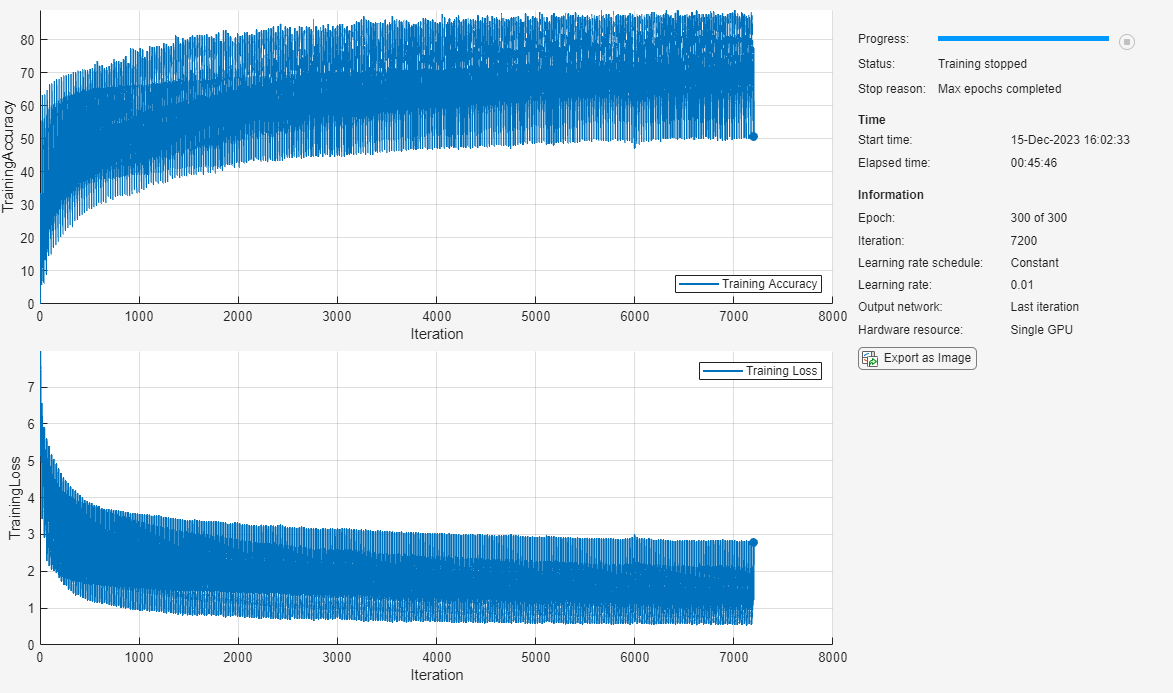 options = trainingOptions('adam', ... 'InputDataFormats','CTB', ... 'MaxEpochs',300, ... 'InitialLearnRate',0.01, ... 'MiniBatchSize',32, ... 'Shuffle','never', ... 'Plots','training-progress', ... 'Metrics', 'accuracy', ... 'Verbose',false);