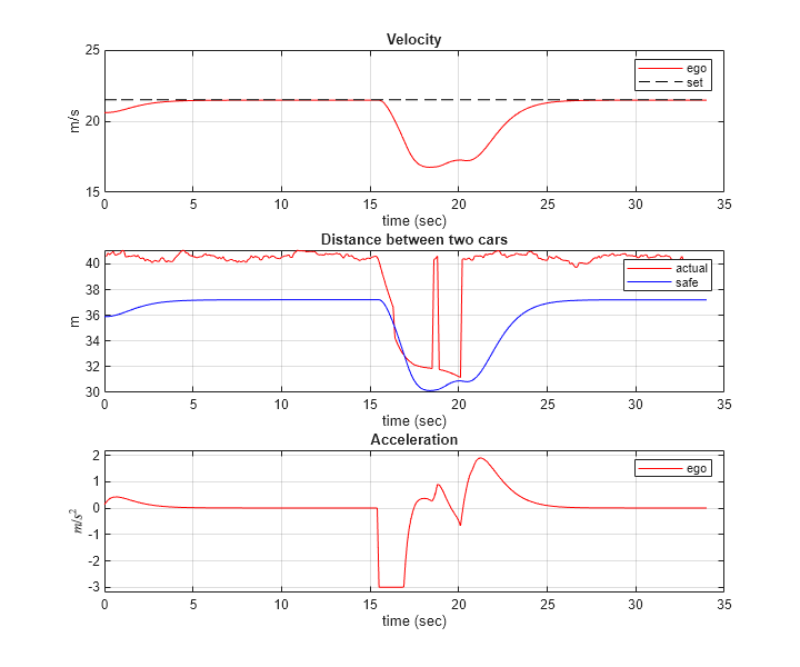 In this example, the raw data from the Tracking and Sensor Fusion system is used for ACC design without post-processing. You can expect to see some 'spikes' (middle plot) due to the uncertainties in the sensor model especially when another car cuts into or leaves the ego vehicle lane.