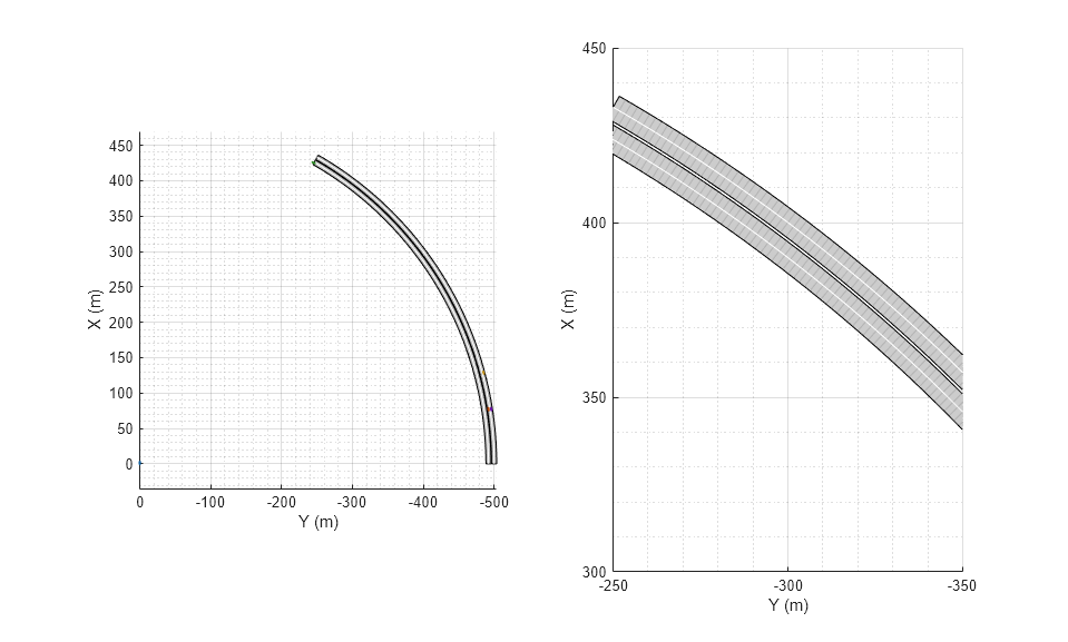 The Driving Scenario Designer app allows you to define roads and vehicles moving on the roads. For this example, you define two parallel roads of constant curvature. To define the road, you define the road centers, the road width, and banking angle (if needed). The road centers were chosen by sampling points along a circular arc, spanning a turn of 60 degrees of constant radius of curvature.