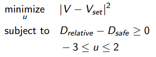 In the classical ACC design, if the relative distance is less than the safe distance, then the primary goal is to slow down and maintain a safe distance. If the relative distance is greater than the safe distance, then the primary goal is to reach driver-set velocity while maintaining a safe distance. These design principles are achieved through the Min and Switch blocks.