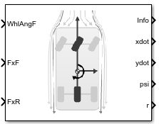The Bicycle Model block implements a rigid two-axle single track vehicle body model to calculate longitudinal, lateral, and yaw motion. The block accounts for body mass, aerodynamic drag, and weight distribution between the axles due to acceleration and steering. There are two types of Bicycle Model blocks.