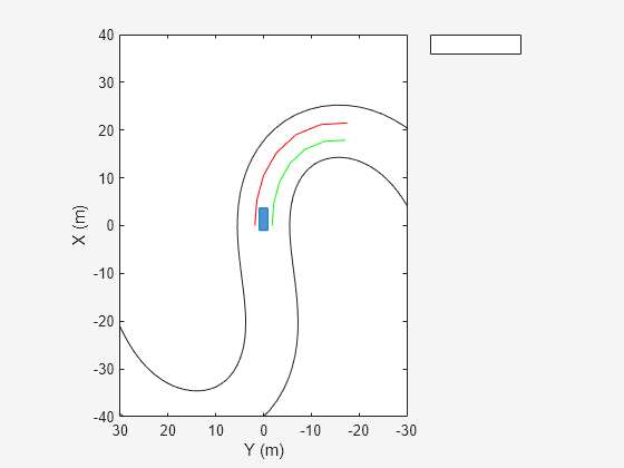 bep = birdsEyePlot('XLim',[-40 40],'YLim',[-30 30]); olPlotter = outlinePlotter(bep); lblPlotter = laneBoundaryPlotter(bep,'Color','r','LineStyle','-'); lbrPlotter = laneBoundaryPlotter(bep,'Color','g','LineStyle','-'); rbsEdgePlotter = laneBoundaryPlotter(bep); legend('off'); while advance(scenario) rbs = roadBoundaries(car); [position,yaw,length,width,originOffset,color] = targetOutlines(car); lb = laneBoundaries(car,'XDistance',0:5:30,'LocationType','Center', ... 'AllBoundaries',false); plotLaneBoundary(rbsEdgePlotter,rbs) plotLaneBoundary(lblPlotter,{lb(1).Coordinates}) plotLaneBoundary(lbrPlotter,{lb(2).Coordinates}) plotOutline(olPlotter,position,yaw,length,width, ... 'OriginOffset',originOffset,'Color',color) end