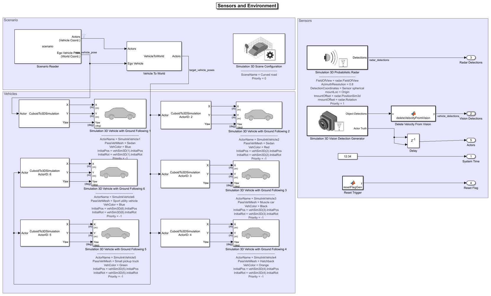 The Sensors and Environment subsystem configures the road network, places vehicles, and synthesizes sensors. For more information, see the Forward Vehicle Sensor Fusion example. Open the Sensors and Environment subsystem.
