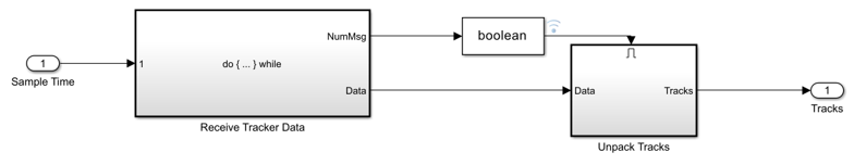Receive Tracker Data— Receives tracker output data sent from the target machine.Unpack Tracks Data— Unpacks the data and convert it into a bus signal.