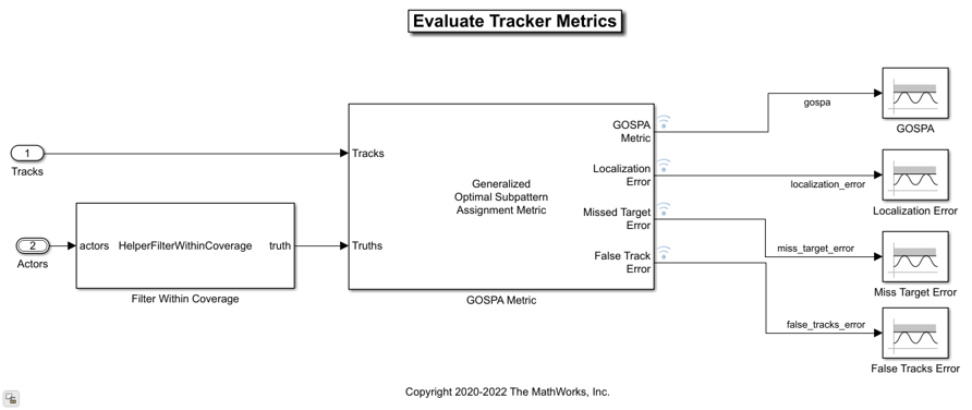 The Evaluate Tracker Metrics subsystem is based on the subsystem used in the Forward Vehicle Sensor Fusion example.