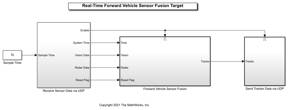 Receive Sensor Data via UDP— Receives data required for the forward vehicle sensor fusion algorithm model to run.Forward Vehicle Sensor Fusion— Enabled subsystem that contains the forward vehicle sensor fusion algorithm.Send Tracker Data via UDP— Sends the tracker output to the host model, which is required byEvaluate Tracker Metricssubsystem of the host model.