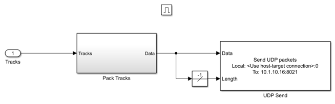 This subsystem sends the tracker output to the host machine using a UDP Send block.