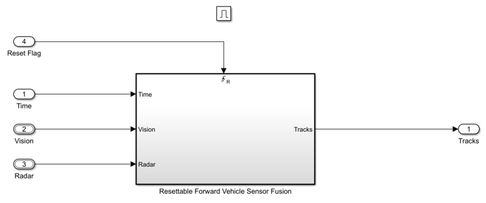 The enabled subsystem contains a resettable subsystem. The resettable subsystem resets the forward vehicle sensor fusion algorithm to its default state when Reset Flag is enabled. Open the Resettable Forward Vehicle Sensor Fusion subsystem.