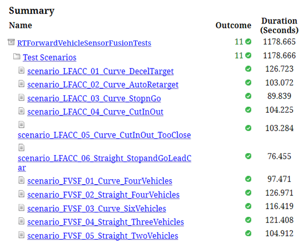 sltest.testmanager.report(resultObj,"Report.pdf", ... Title="Real-Time Forward Vehicle Sensor Fusion", ... IncludeMATLABFigures=true, ... IncludeErrorMessages=true, ... IncludeTestResults=false, ... LaunchReport=true);
