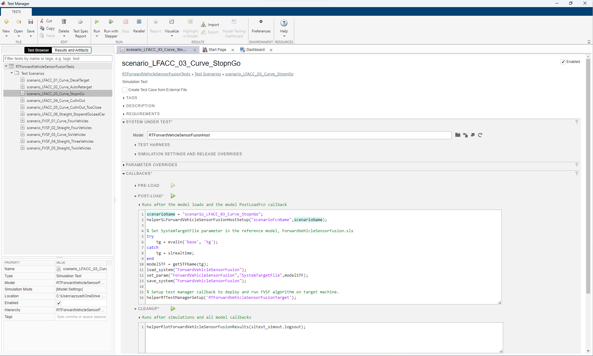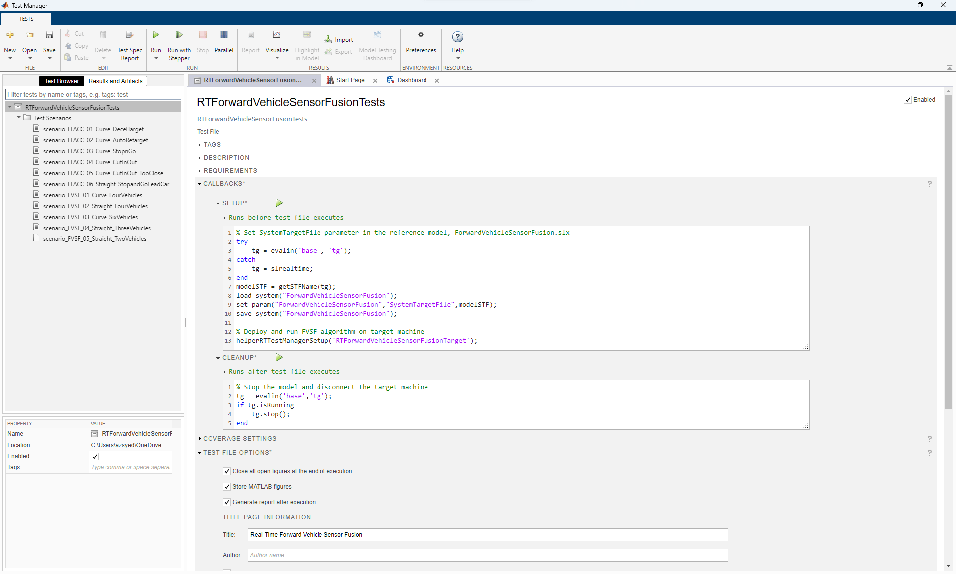 Open the test file RTForwardVehicleSensorFusionTests.mldatx in the Test Manager and explore the configuration.