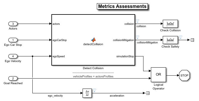 Review the test bench model — Review a system-level autonomous emergency braking test bench model that contains metric assessments. These metric assessments integrate the test bench model with Simulink Test for automated testing.