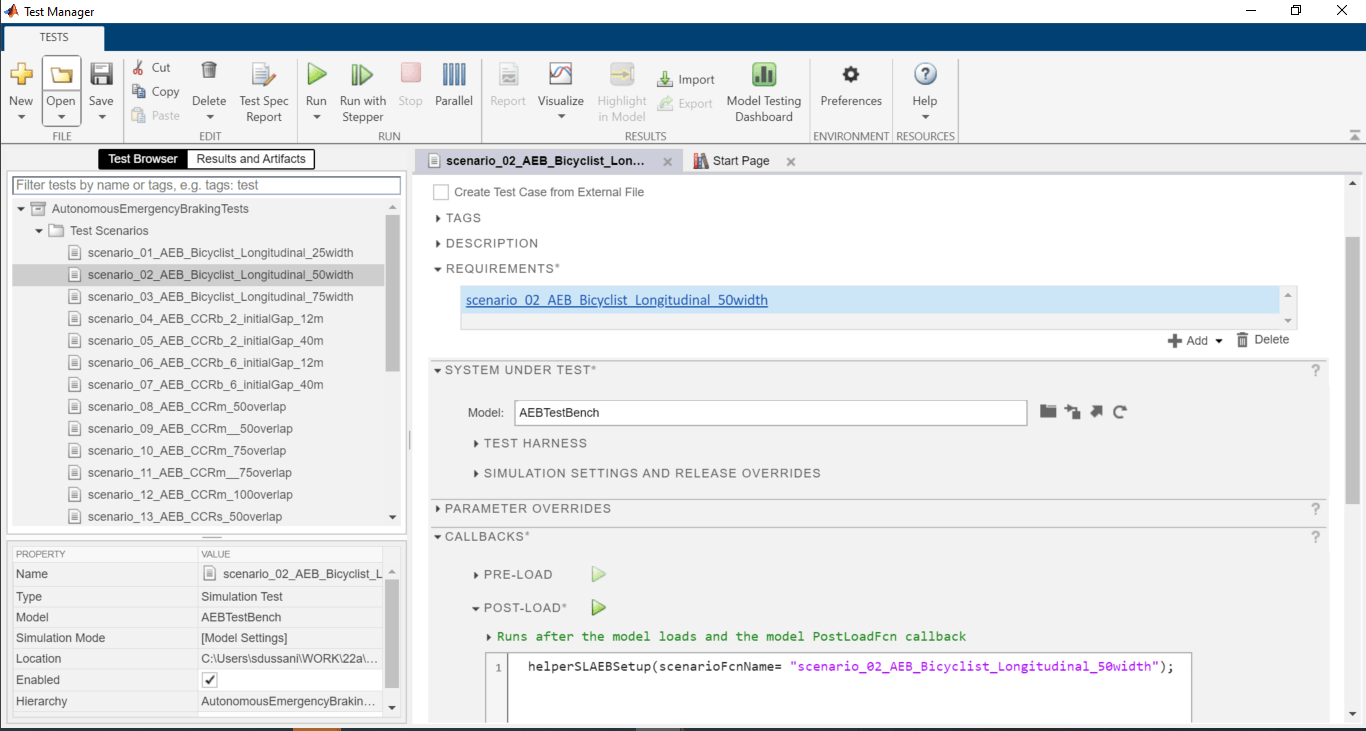 To explore the test requirements and test bench model, load the autonomous emergency braking project. The TestAutomation folder contains the files for automating testing.