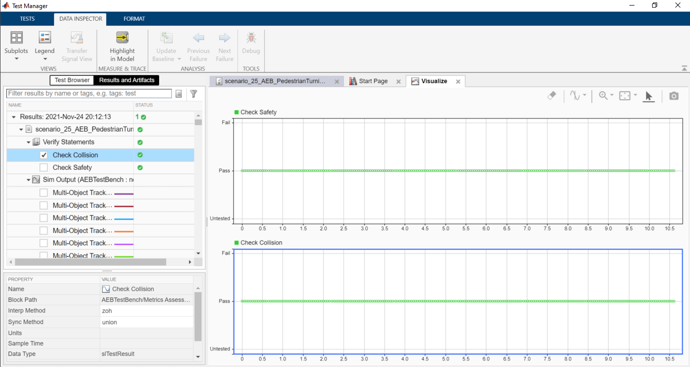 testSuite = getTestSuiteByName(testFile,"Test Scenarios"); testCase = getTestCaseByName(testSuite,"scenario_25_AEB_PedestrianTurning_Nearside_10kph"); resultObj = run(testCase);