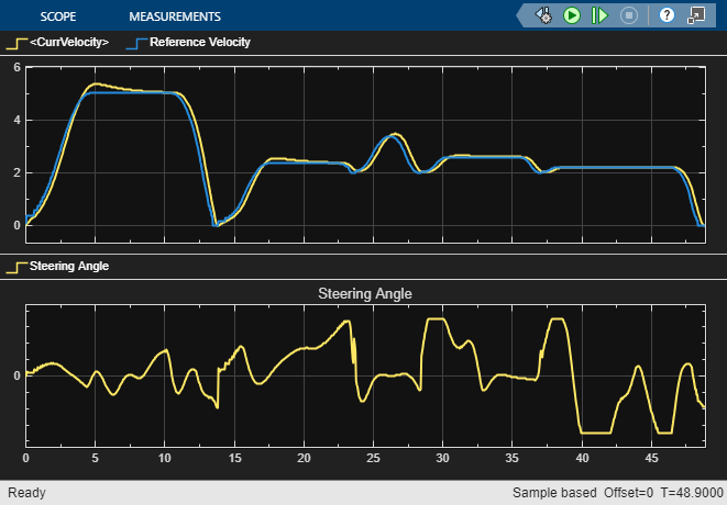 The Visualization block shows how the vehicle tracks the reference path. It also displays vehicle speed and steering command in a scope. The following images are the simulation results for this example: