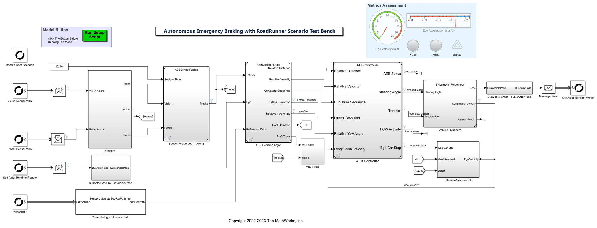 Sensors— Subsystem that specifies the actors, camera, and radar sensor used for simulation from the RoadRunner scenario.Sensor Fusion and Tracking— Algorithm model that fuses vehicle detections from the camera to those from the radar sensor.AEB Decision Logic— Algorithm model that specifies the lateral and longitudinal decision logic that provides the most important object (MIO) related information and ego vehicle reference path information to the controller.AEB Controller— Algorithm model that specifies the steering angle and acceleration controls.Vehicle Dynamics— Subsystem that specifies the dynamic model of the ego vehicle.Generate EgoReference Path— Subsystem that calculates the reference path attributes using the path information from RoadRunner Scenario.Metrics Assessment— Subsystem that assesses system-level behavior.