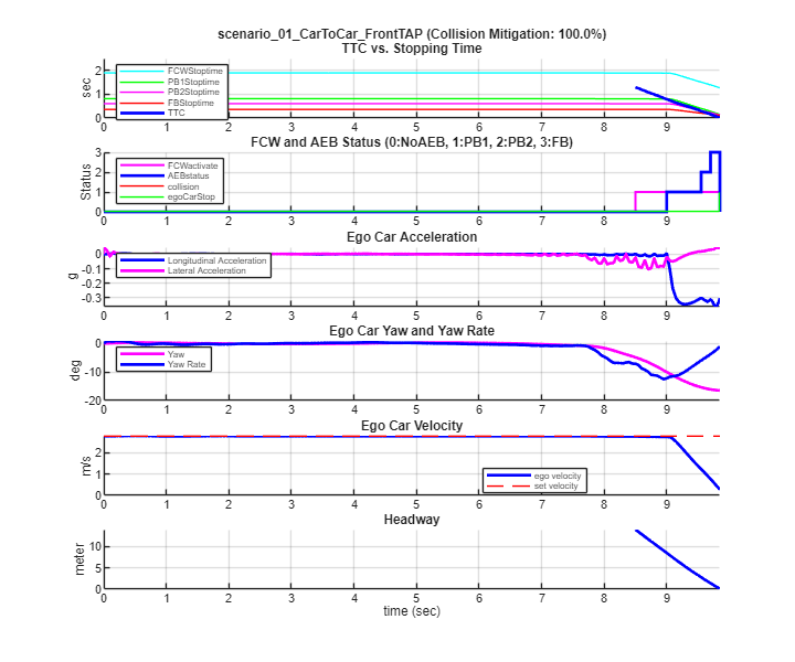 TTC vs. Stopping Time — Compares the time-to-collision and the stopping times for the forward collision warning (FCW), first stage partial brake, second stage partial brake, and full brake, respectively. For more information about multi-stage partial braking, see Autonomous Emergency Braking with Sensor Fusion.