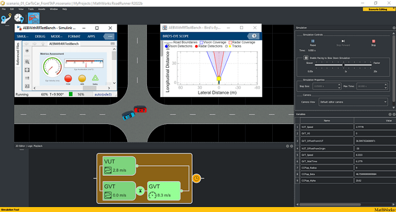 AEB is an advanced active safety system that helps drivers avoid or mitigate collisions with other vehicles. This example shows how to use RoadRunner Scenario to simulate the AEB test bench model used in the Autonomous Emergency Braking with Sensor Fusion example.