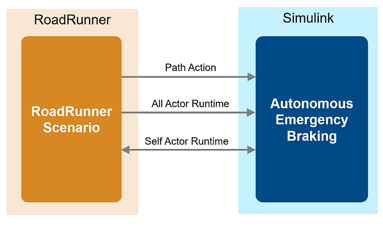 This figure shows an overview of the information exchanged between RoadRunner Scenario, and autonomous emergency braking test bench model in Simulink. The autonomous emergency braking model reads all actor runtimes from RoadRunner Scenario and utilizes the actors pose and ego pose information for Simulation. The model gets the vision and radar detections from the sensors and uses this information to control the ego vehicle and writes back the updated ego pose to RoadRunner Scenario.