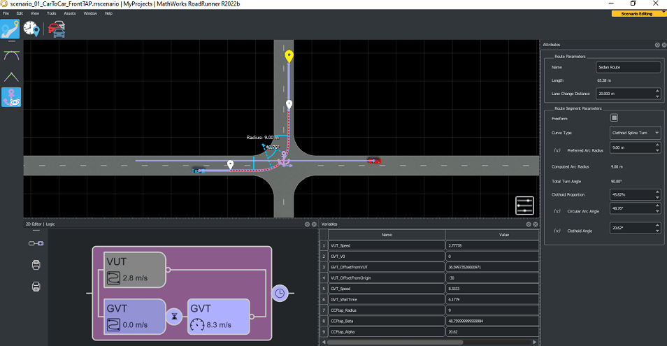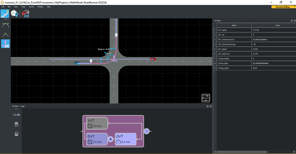 scenario_01_CarToCar_FrontTAP contains variables that enable you to vary the VUT trajectory parameters and GVT wait times, as shown in this image.