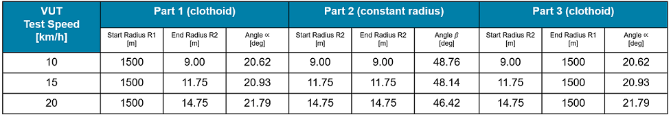 The GVT travels on a straight-line path. The VUT travels straight, makes a left turn, and then travels straight again. The initial and final straight-line trajectories of the VUT are clothoid, and during the turn, the trajectory has a fixed radius per the Euro NCAP Test Protocol - AEB Car-to-Car systems version 3.0.1. The scenario_01_CarToCar_FrontTAP scenario has a VUT test speed of 10 km/h, or 2.778 m/s. The VUT trajectory parameters, Computed Arc Radius and Circular Arc Angle are 9 m and 48.76 degrees, respectively. You can also configure this scenario for other VUT speeds. For more details, see the Simulate with Scenario Variants section of this example.