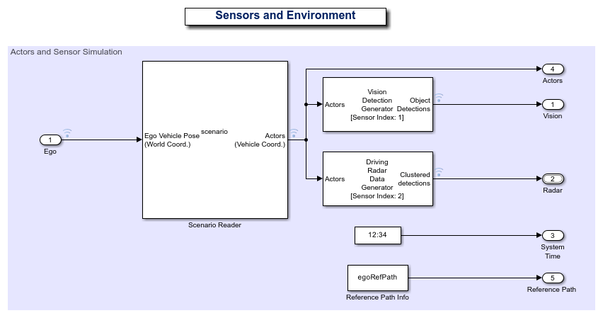 The Sensors and Environment subsystem configures the road network, defines target actor trajectories, and synthesizes sensors. Open the Sensors and Environment subsystem.
