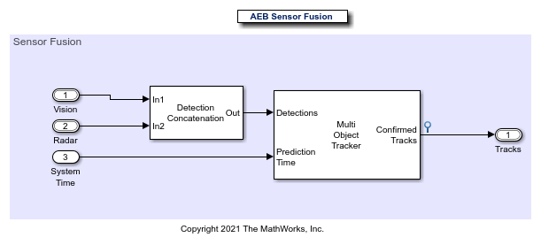 Multi-Object Tracker — Performs sensor fusion and outputs the tracks of stationary and moving objects. These tracks are updated at Prediction Time, specified by a Digital Clock block in the