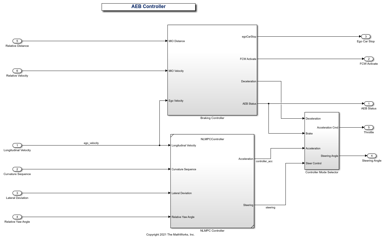 AEB Controller outputs the steering angle and acceleration commands that determine whether to accelerate or decelerate.