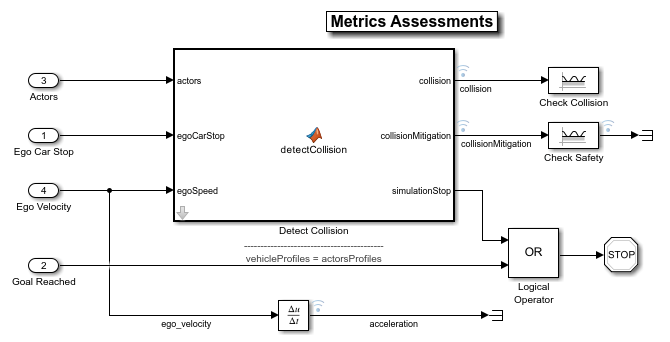 The Metrics Assessment subsystem enables system-level metric evaluations using the ground truth information from the scenario. Open the Metrics Assessment subsystem.
