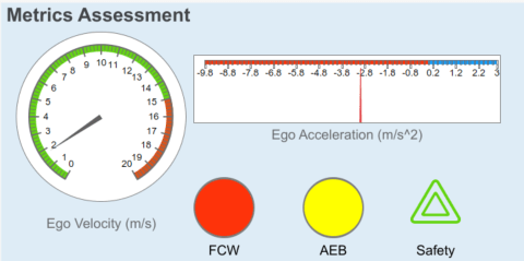 Check Collision— Verifies whether the ego vehicle collide with the target actor at any point during the simulation.Check Safety— Verifies that the ego vehicle is within the prescribed thresholdsafetyGoalthroughout the simulation. Use thehelperAEBSetuppost-load callback function to definesafetyGoal.
