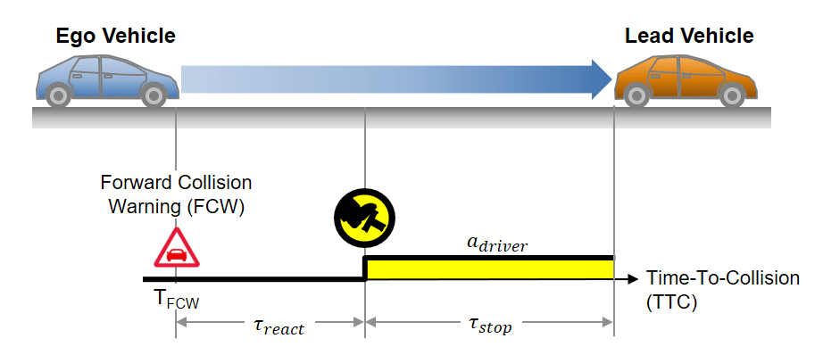 The FCW system alerts the driver about an imminent collision with a lead vehicle. The driver is expected to react to the alert and apply the brake with a delay time,