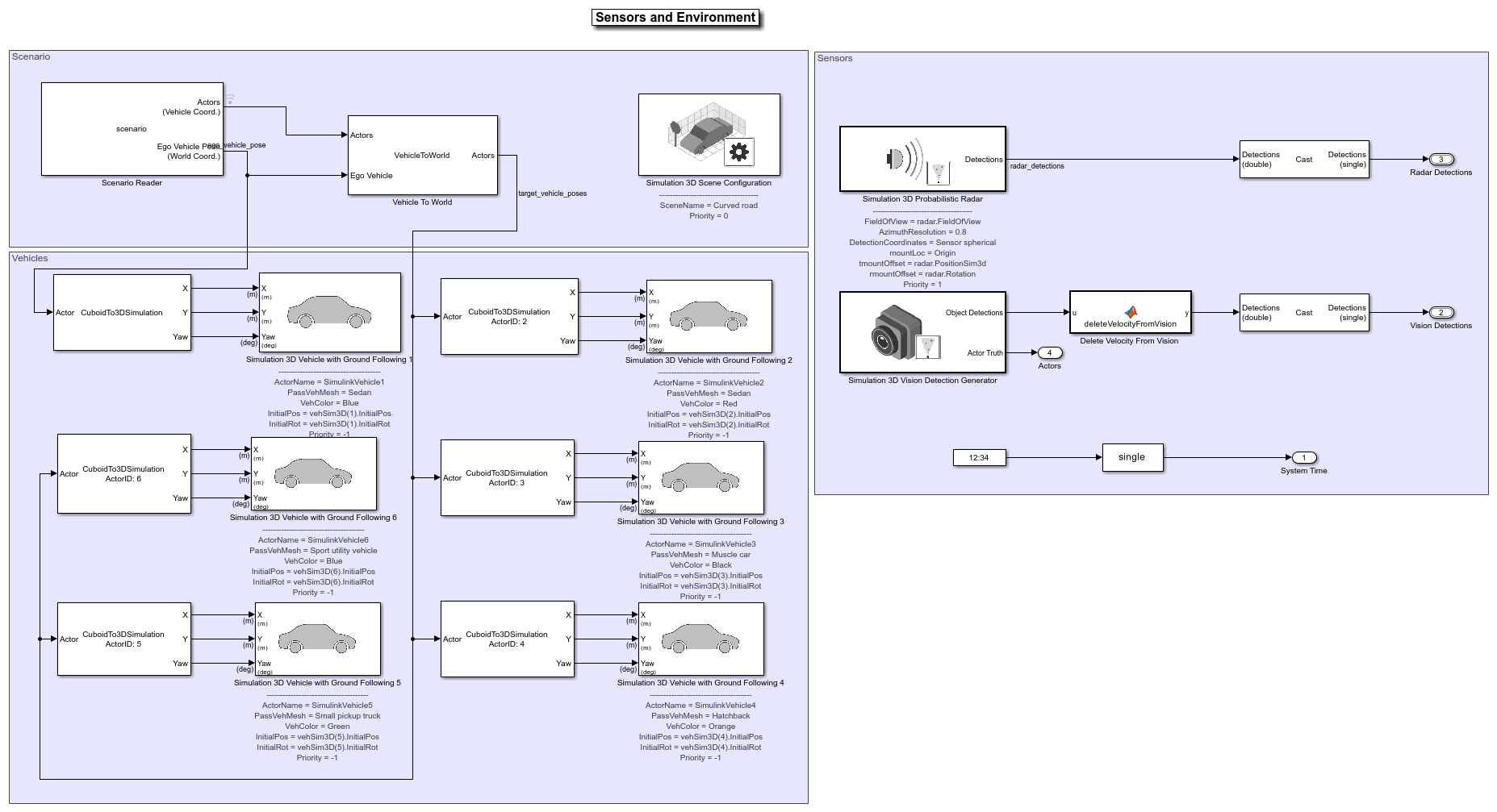 The Sensors and Environment subsystem configures the road network, places vehicles, and synthesizes sensors. For an example that uses a similar subsystem, see Highway Lane Following. Open the Sensors and Environment subsystem.