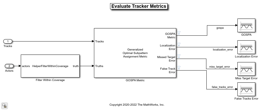 The subsystem contains GOSPA metric block, which computes these metrics: