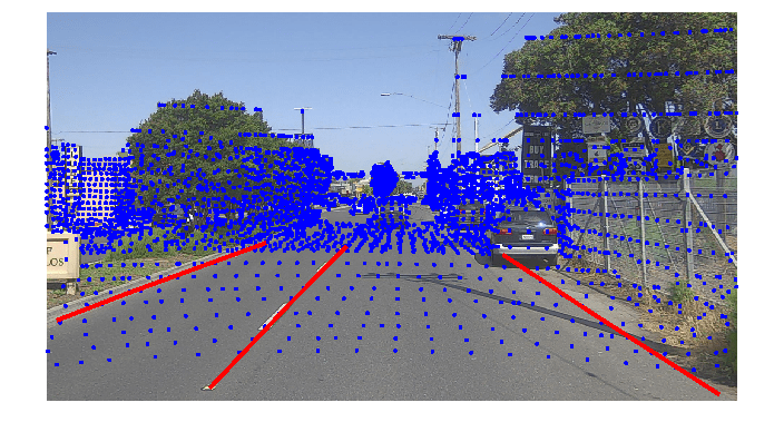 % Create a lidar to camera rigid transformation rigidtform3d object tform rot = quat2rotm(calibration.camera_to_lidar.heading(1,:)); tran = calibration.camera_to_lidar.position(1,:); tform = invert(rigidtform3d(rot,tran)); % Downsample the first point cloud data for better visualization and project it onto image coordinate frame ptCld = pcdownsample(ptCld,gridAverage=0.5); imPts = projectLidarPointsOnImage(ptCld,sensor.Intrinsics,tform); % Overlay the projected point cloud onto the image figure imshow(img); hold on plot(imPts(:,1),imPts(:,2),"b.") % Overlay lane boundary labels onto the image for i = 1:length(boundaries) boundary = boundaries(i); points = boundary.Position; plot(points(:,1),points(:,2),LineWidth=3,Color="r") end hold off