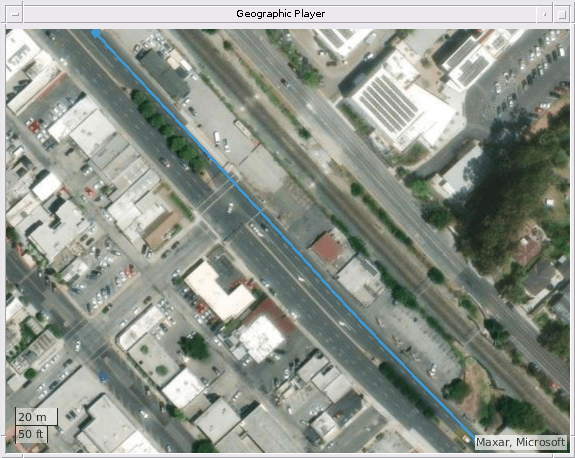 Visualize geographic map data with GPS trajectory of ego vehicle by using the helperPlotGPS function. Note that, in the figure the ego vehicle is moving from bottom-right to the top-left on the trajectory.