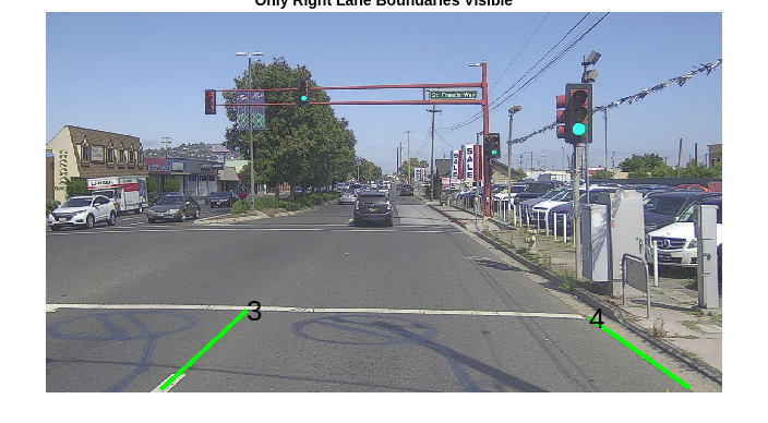 In a road segment, lane boundary labels may be missing for a few frames due to the lane boundary being occluded or moving out of the camera field-of-view. For example, in the image on the right, you can observe that as the ego-vehicle gets closer to the junction, the left-most lane boundaries move outside the camera field-of-view. To extract the points for each lane boundary for the entire sequence, you must map the two visible lane boundaries in the image on the right with the two right-most lane boundaries in the image on the left.