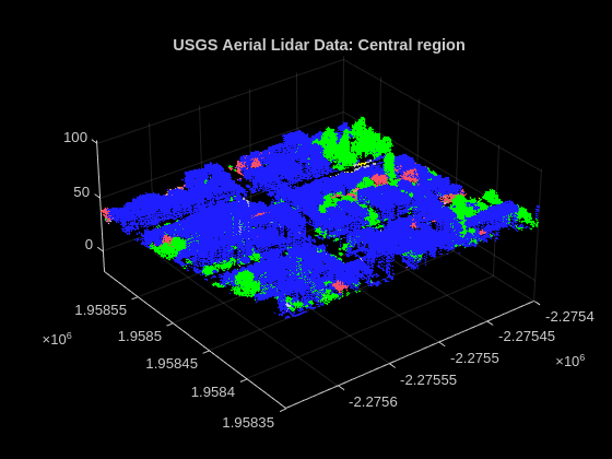 For this example, download a ZIP file containing lidar data from the 3DEP LidarExplorer, and then unzip the file. Load the point cloud data into the workspace using the readPointCloud (Lidar Toolbox) function of the lasFileReader (Lidar Toolbox) object, and visualize the point cloud.