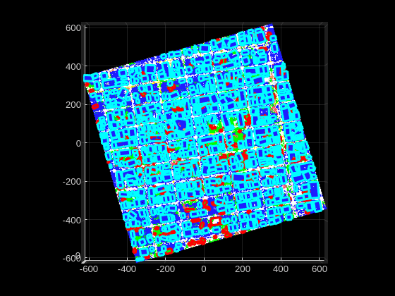% Segment the non-ground point cloud to perform segmentation. [groundPtsIdx,pc,~] = segmentGroundSMRF(registeredPointCloud); % Remove points with Inf or NaN coordinate values from the point cloud. pc = removeInvalidPoints(pc); % Load the color map. cmap = helperAerialLidarColorMap; % Set the size of the blocks for the blocked point cloud. bpdSizeinMeters = [100 100]; % Perform segmentation using the helperRandLANetSegmentObjects function, and store the results in labels. labels = helperRandLANetSegmentObjects(pc,bpdSizeinMeters);