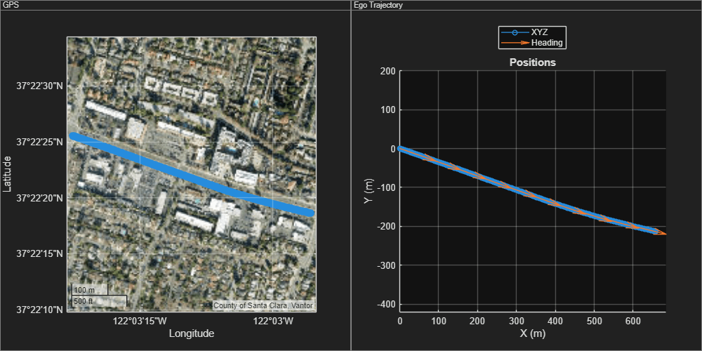 f = figure(Position=[500 500 1000 500]); gpsPanel = uipanel(Parent=f,Position=[0 0 0.5 1],Title="GPS"); plot(gpsData,Parent=gpsPanel,Basemap="satellite") trajPanel = uipanel(Parent=f,Position=[0.5 0 0.5 1],Title="Ego Trajectory"); plot(egoTrajectory,ShowHeading=true,Parent=trajPanel)